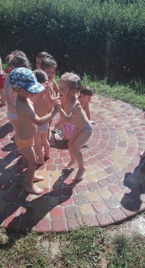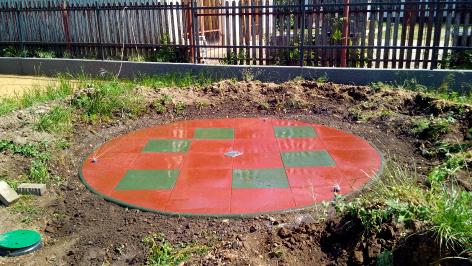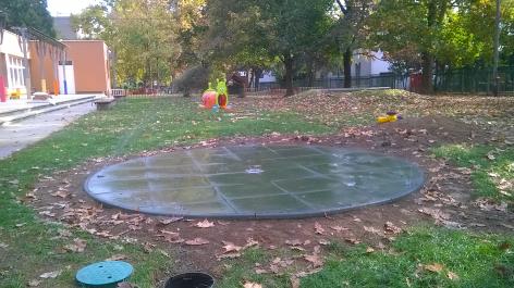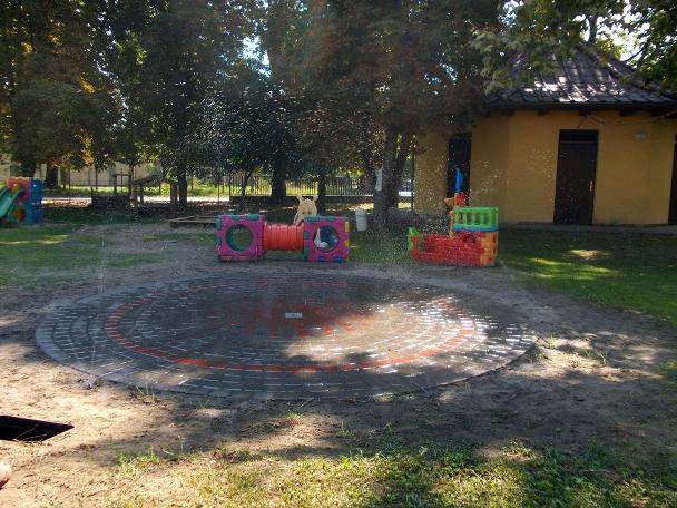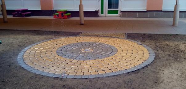 Az utóbbi években átadott 2 db 3 méter átmérőjű, gumitégla burkolatú vízpermetező a Bonyhádi Varázskapu bölcsődében és óvodában |